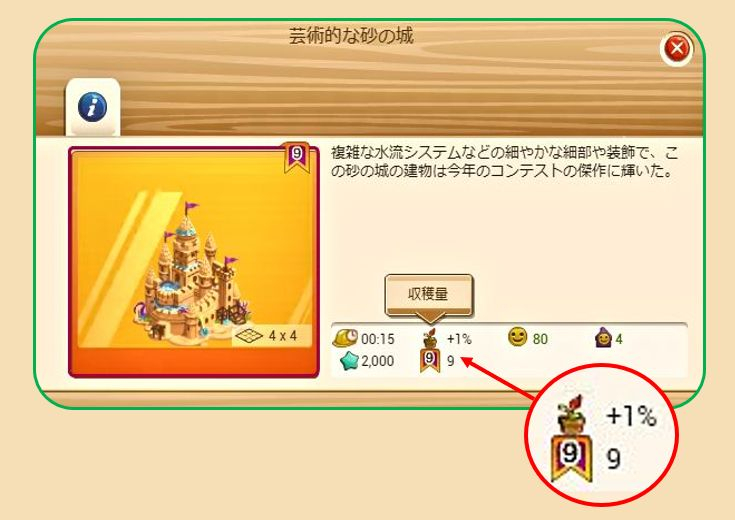これなどもその一つで「収穫量+1%」となっています。過去には畑の収穫、動物小屋の収穫量アップなどの機能が付加されたものがありましたが、単に収穫量と書かれているので畑、原っぱ、果樹園、動物小屋等の総てに有効なのか制限があるのか分かりません。植木鉢の絵柄なので、鉢植えだけに有効?