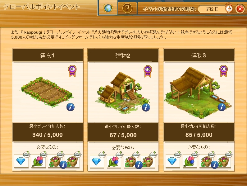 ダイアモンドも寄付のアイテムに入っていますから、余程欲しい田舎のなんとかがなければ参加する意義はないと思うのですが・・・