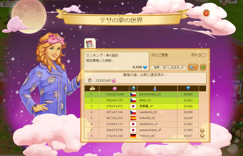 自分はLV94。ダイヤ1万個はあったけど、やっぱりグルメが入ると難しいです。土地は全部買えて、風車のアップも最後まで出来ました。