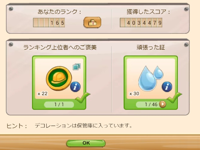 たまたまいつまで続けるかわからないから、もう風船ルレチップ持っていても仕方ないと思って手持ちのチップ全部使い果たした結果、10万G ゲットしてあまつさえランキング1位になったからこれ幸いとGを使って一気にジャム工場2個一気に建てて最高レベルまでのし上げたんだけど、そんなことでもなければこの短期間でできるわけがない。