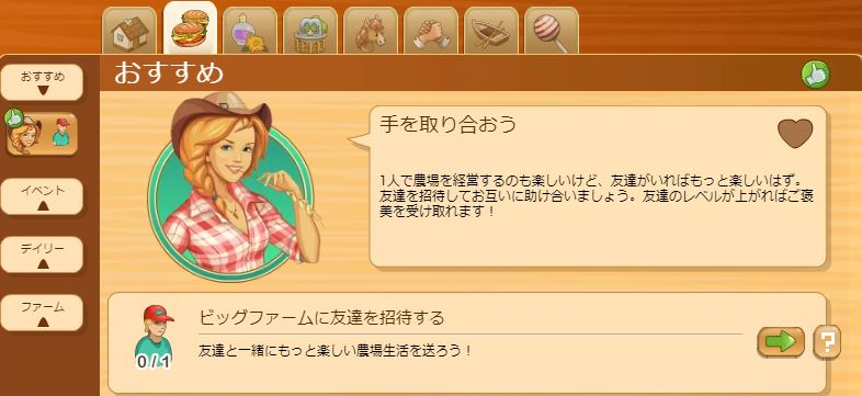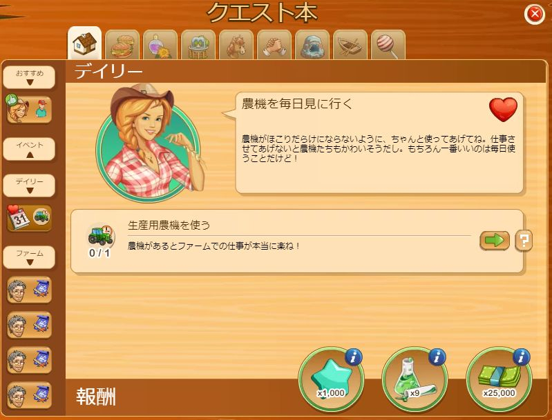 クエストログは、今までクエストがあった場所にあるから、クリックして見てみてね。選択中のファーム専用に、デイリー、イベント、おすすめ、などのカテゴリーに分けてあるわ。