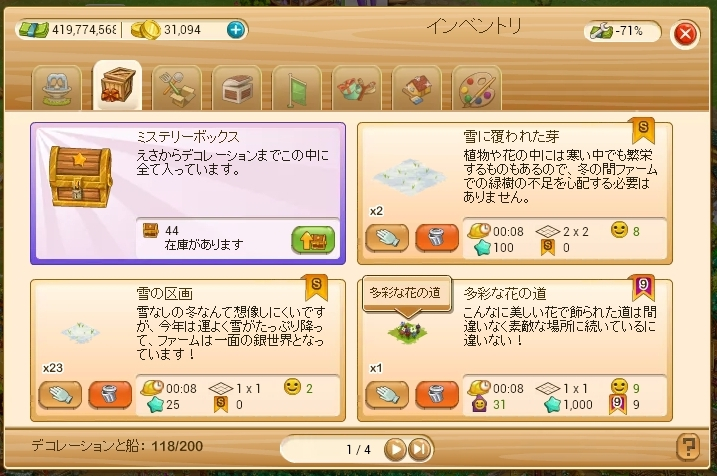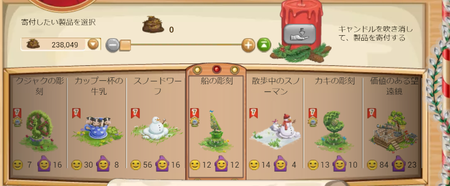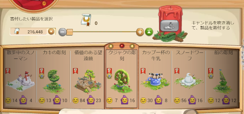 狙っていたのはこの並び、カキ、クジャク、スノードワーフ、船、散歩のスノーマンは持っていないので、
