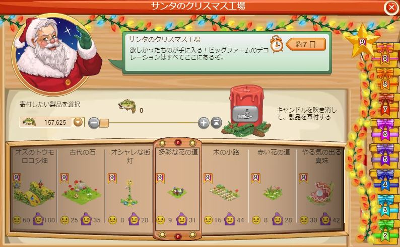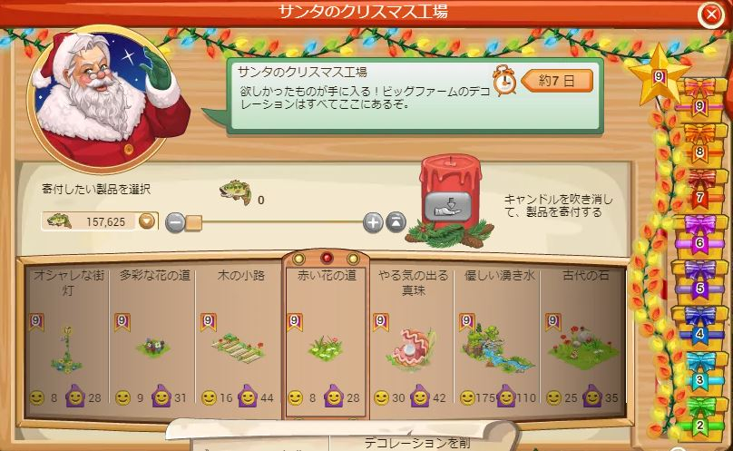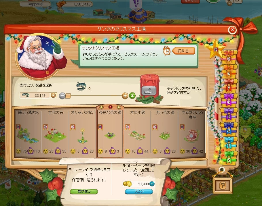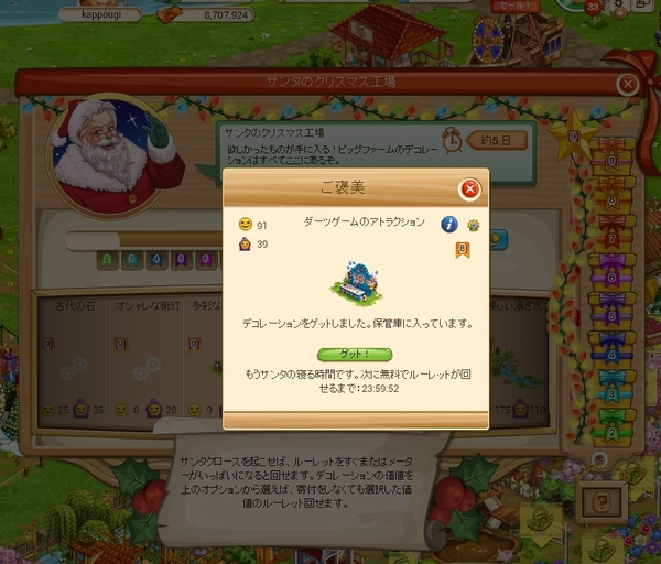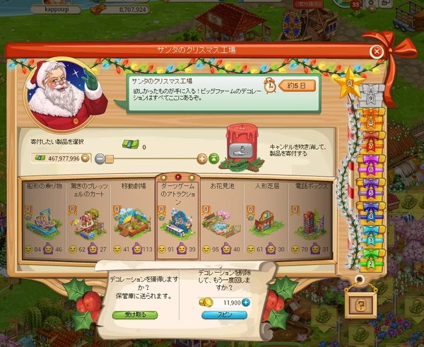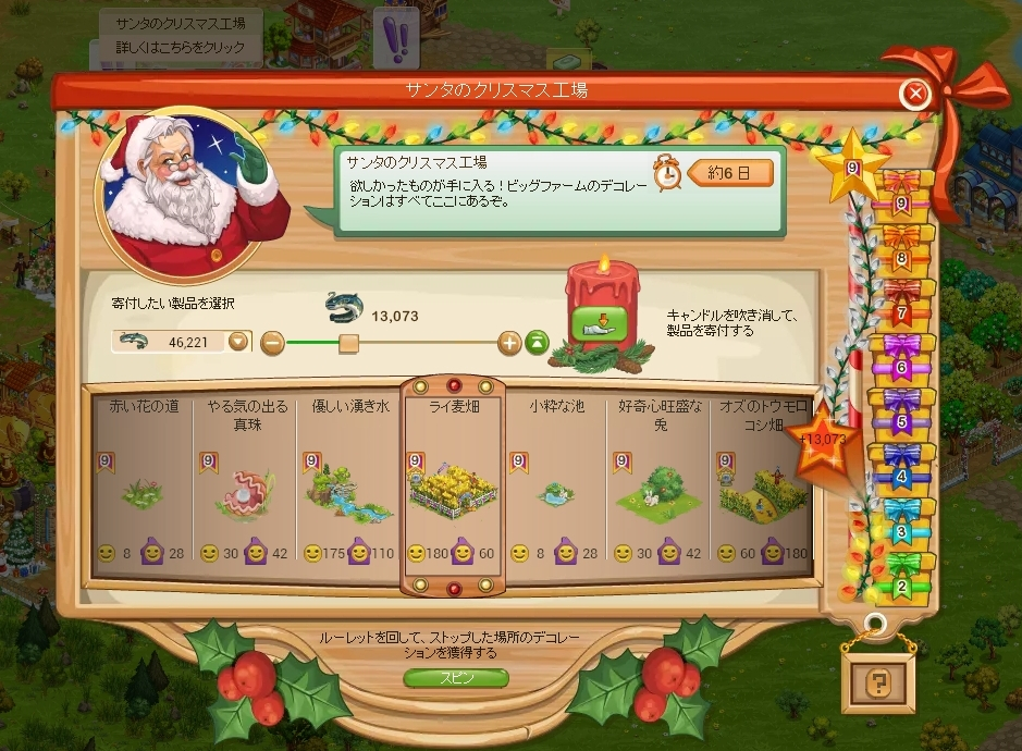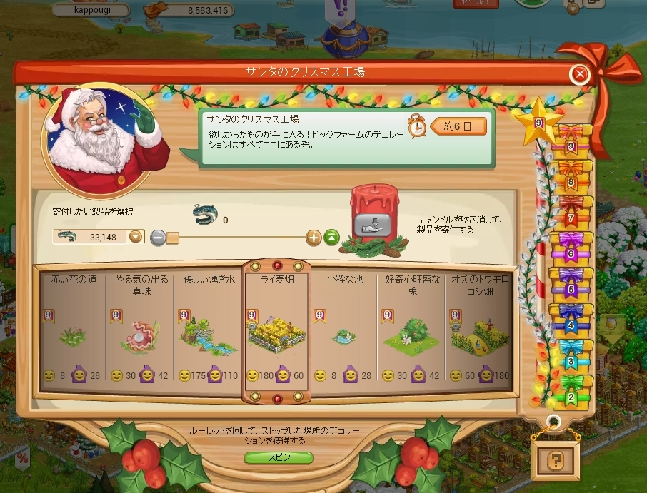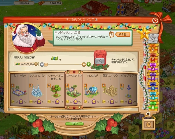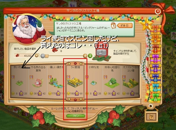 クリスマス工場は寄付を終えたときに表示されている7個のデコをスピンさせて、そのうちのどれか1つが当たる仕様です。