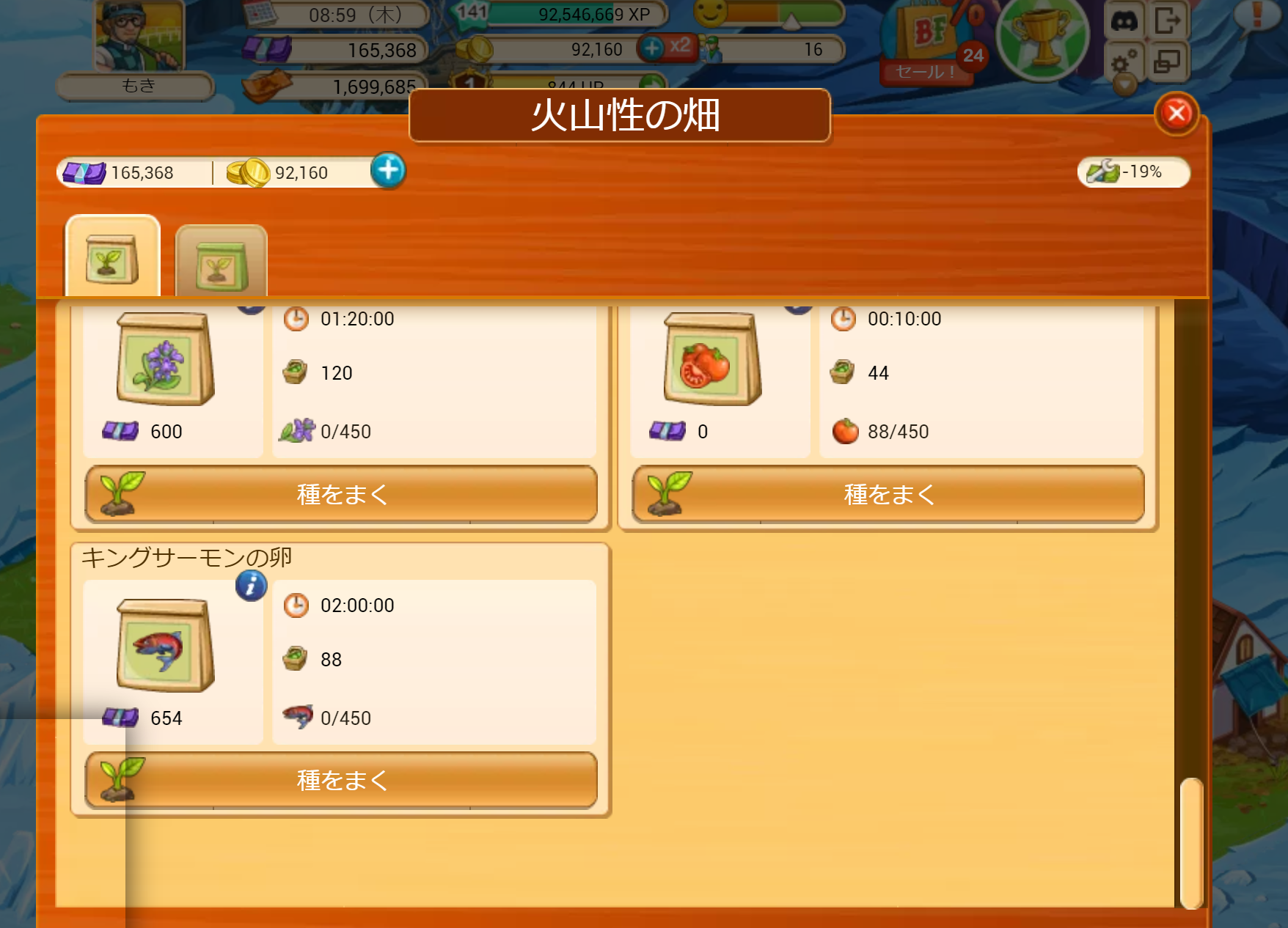 1つの畑で一度に収穫できるキングサーモンは88、倉庫の容量は450、