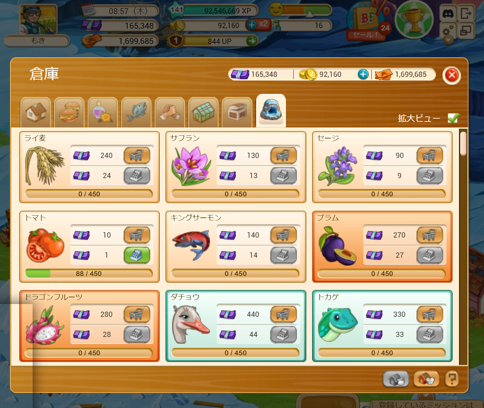 例のバグは、倉庫の収穫物が0(ゼロ)であっても収穫した瞬間に表示され、