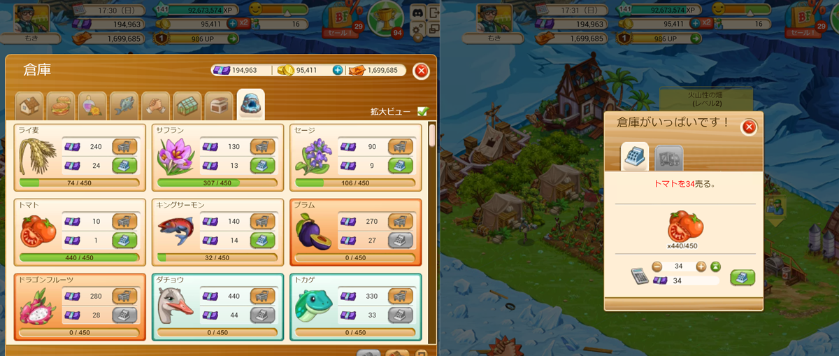 【▲倉庫内440/450、収穫量44/回、倉庫に入れた後で余る34だけを売るといういたって当たり前のアラート】