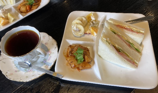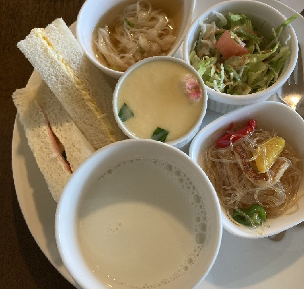 ドリングはホットミルク、それにサンドイッチ2切とそうめん、ビーフンだか春雨サラダかよくわからないもの、茶わん蒸し、そしてサラダがついて450円です。