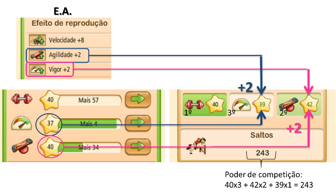 Como pode ver na imagem, os atributos marcados com verde são os mais importantes na competição de saltos (por exemplo), e se o seu cavalo for bem treinado nesses atributos ele terá um desempenho maior.