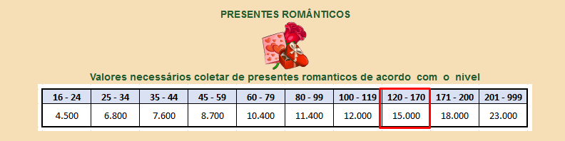 Valores necessários para coletar os presentes românticos de acordo com o nível
