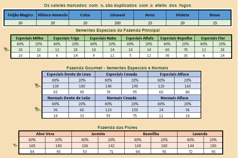 Aqui os valores atualizados para as sementes de evento. Os valores com fogos são duplicados.