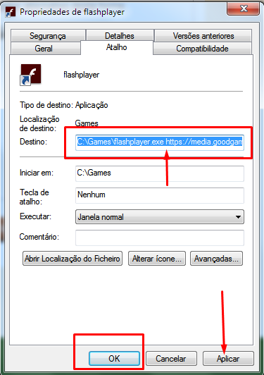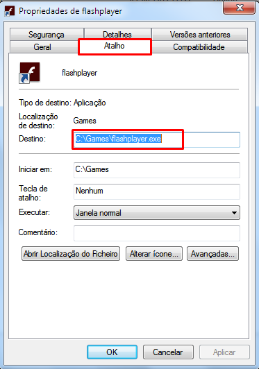 4 . Ao abrir "Propriedades" vamos ao separador Atalho para o podermos associar permanentemente ao jogo BigFarm desta forma: