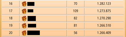 Todos os eventos de trabalho esforçado mostram as 50 primeiras posições seguidas e depois apenas o jogador imediatamente à frente e atrás do dono da conta e o que aparece no meio, onde está assinalado, são os níveis de cada jogador, como pode ver pelo exemplo abaixo do meu servidor: