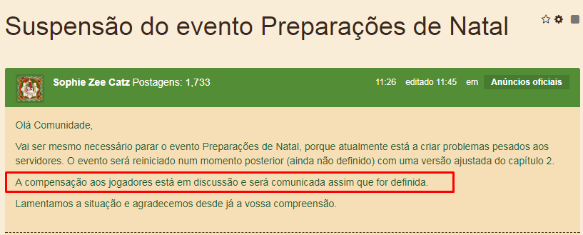 Não vale a pena enviarem tickets para o suporte técnico àcerca dos recentes problemas no evento de Natal, por isso, por favor, não o façam.