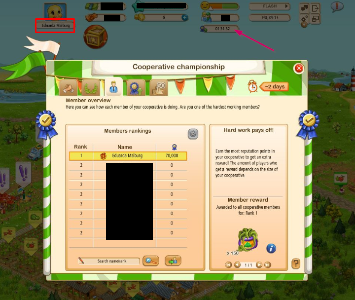 Como me orientei pelas mãos com cronômetro na parte de cima, fiz 2 missões que não foram computados os meu pontos. Fiquei em 2º lugar nas rações e 3º nos ovos. Para completar gastei ouro, húmus e pedi brilho.
