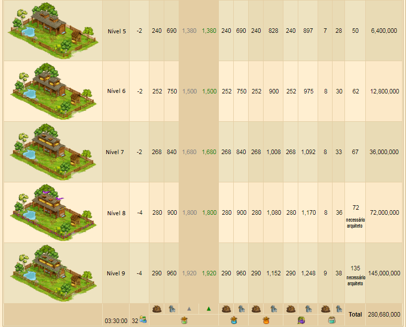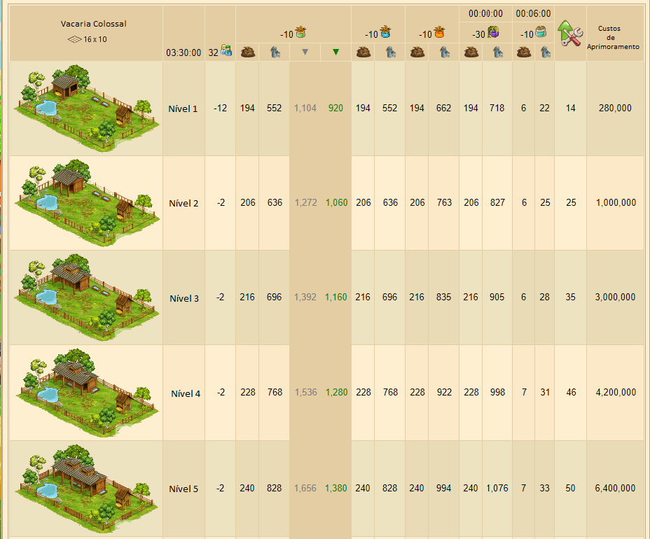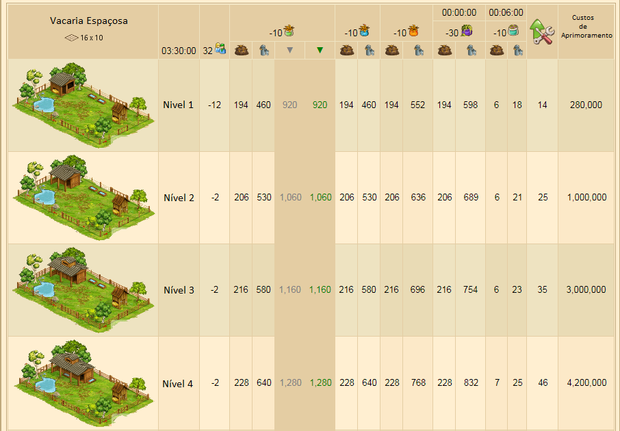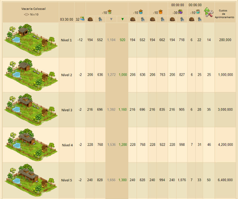 mostram o total de leite ao fim de 7 horas - Uma vacaria normal necessita de 64 trabalhadores para alcançar o nível 4 mas uma vacaria gigante nível 6 apenas precisa de 32 trabalhadores