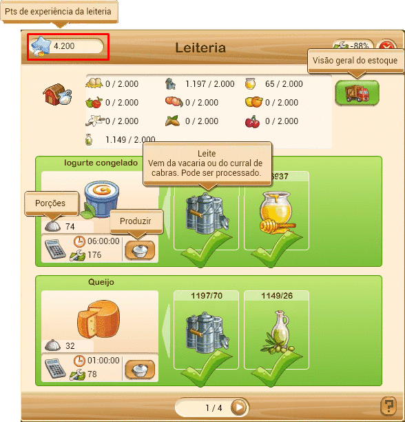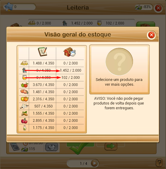 Dica: Quando você colhe produtos nas suas fazendas e seu armazém fica sobre-lotado, para transferir os ingredientes para a leiteria você também pode clicar no botão