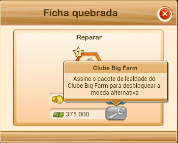 - A reparação da ficha quebrada é normalmente feita usando ouro, mas se tiver uma assinatura mensal Big Farm pode fazê-lo usando dólares de fazenda