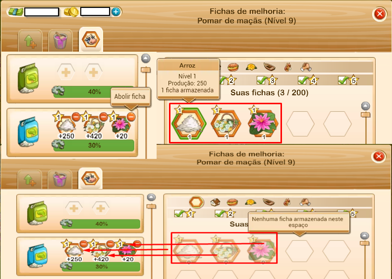 # Fichas para frutas não dão folhas adicionais, fichas para animais não dão estrume adicional.# As fichas de melhorias podem ser utilizadas várias vezes nas produções até que a mesma se quebre.