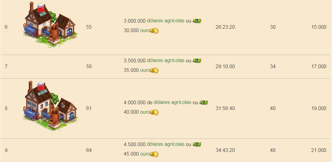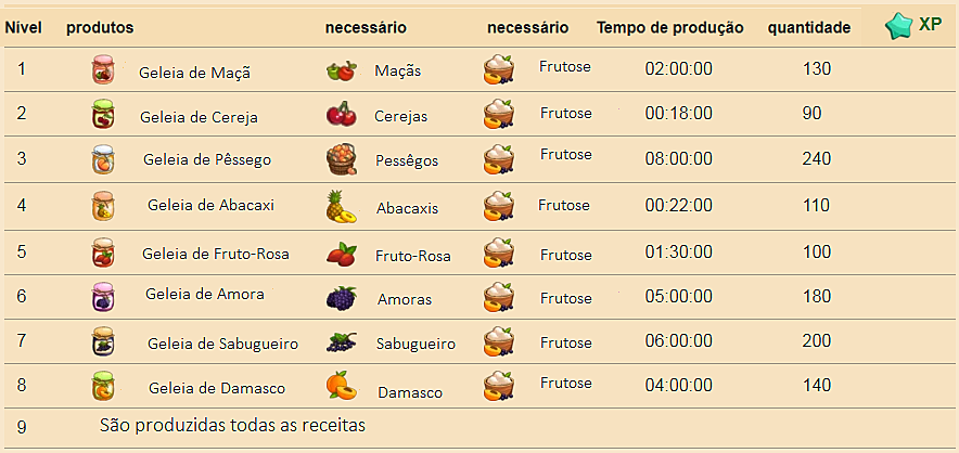- A quantidade de ingredientes necessários para produção permanece a mesma do nível 1 a 8