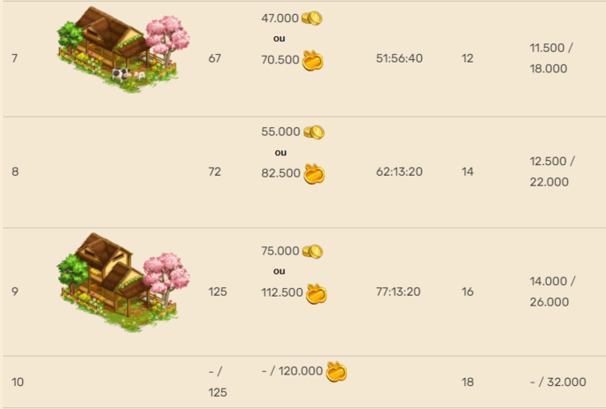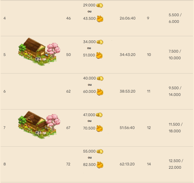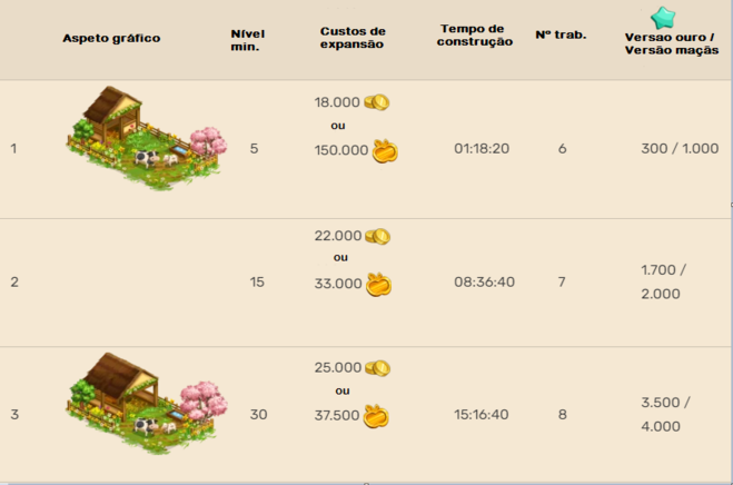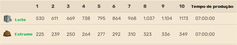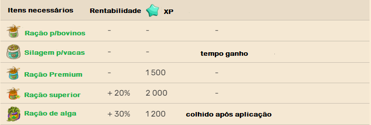 Nota importante: A quantidade de produção pode ser aumentada através do tipo de alimento usado, nível dos livros, máquina de fazenda força total, impulsionadores comprados ou obtidos por tempo limitado, e impulsionadores do quadro de melhorias.