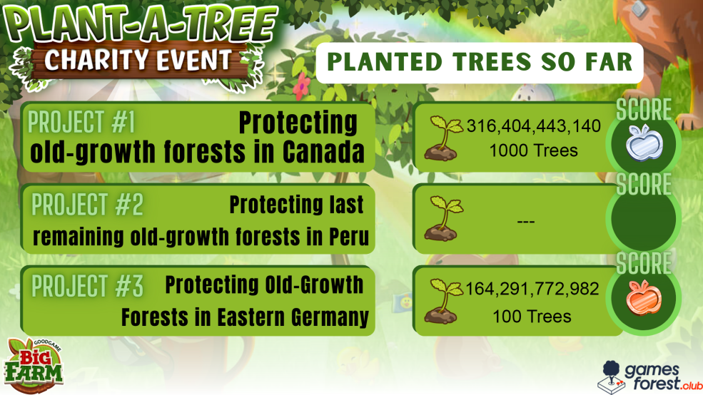 🌳 Com o Evento de Pontos Global poderá colher o máximo que puder e doar os ganhos a um dos três edifícios de eventos. 🌲 Estes funcionarão como objetivos a alcançar dentro do jogo: ao atingir cada objetivo, doaremos árvores aos diferentes projectos GamesForest e, desta forma, iremos cultivamos a nossa floresta digital. 🌳 Quantos mais pontos acumular mais árvores iremos plantar.