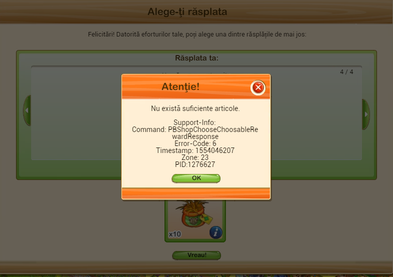 Da, problema încă este în joc din nefericire, și nu apare doar la jetoane și hrană portocalie, am văzut că apare la mai multe recompense care se dau la alegere! Atunci când s-a terminat evenimentul cu târgul și mi-am ales un premiu, după ce am ales o data premiul dorit (un staul) a apărut apoi să aleg a doua oară și bineînțeles că am primit mesaj de eroare.