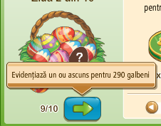 La eventul cu oua , misiunea zilnica "gaseste oua ascunse " am dat pe sageata arata-mi oua cred ca acolo ia galbeni desii nu arata ca , costa galbeni ... am sa fiu mult mai atenta maine caci azi am gasit deja (cred ca acolo este bug ceva altfel nu gasesc explicatia)