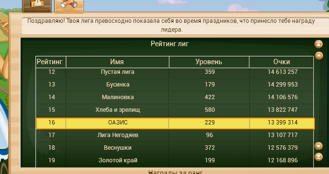 Лига Оазис ждет новых друзей )) Играем для удовольствия, а не для рейтинга. Правила наши - взносы добровольные, золото не требуем, участвовать в мероприятиях по мере возможности и силы. Уровень фермы не важен, но главное - играть, а небезучастно сидеть в лиге.
