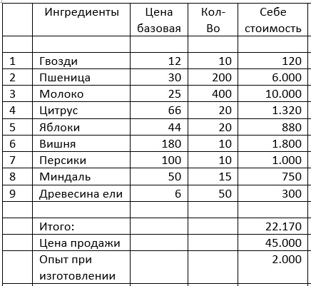 Себестоимость 50000, продажа 450000, выход 2000 шт., время приготовления 4 часа, очки опыта 15000.