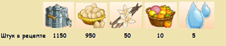 Ингридиенты: Сахар - 1 ед. ($ 18200); пшеница - 200 ед. ($ 6000); молоко - 2000 ед. ($70000); яйца - 400 ед. ($ 6400); подсолнечник (цветы) ($ 3100) - 10 ед. Общие расходы - $ 103700 Запуск производства (при нулевом уровне счастья) - $ 10000 Общая себестоимость - $ 113700 Выход - 436 шт. Опыт - 1000 за каждый сбор Стоимость - 1000/шт. Доход с продажи - $ 436000 Назначение - для свободной продажи и для прохождения одного из этапов недельного ивента на деликатеске. Время приготовления - 1,5 ч. Доступ к рецепту открывается с 90-го уровня игрока.