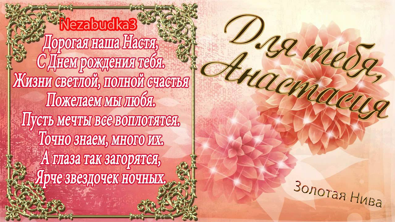 Анастасия — светлый лучик, На небосклоне наших дней. Желаем Насте найти ключик, Что открывает сто дверей. Здоровья, удачи и счастья От всего сердца желаем Будь самой любимой Настюша С днем рожденья тебя поздравляем.
