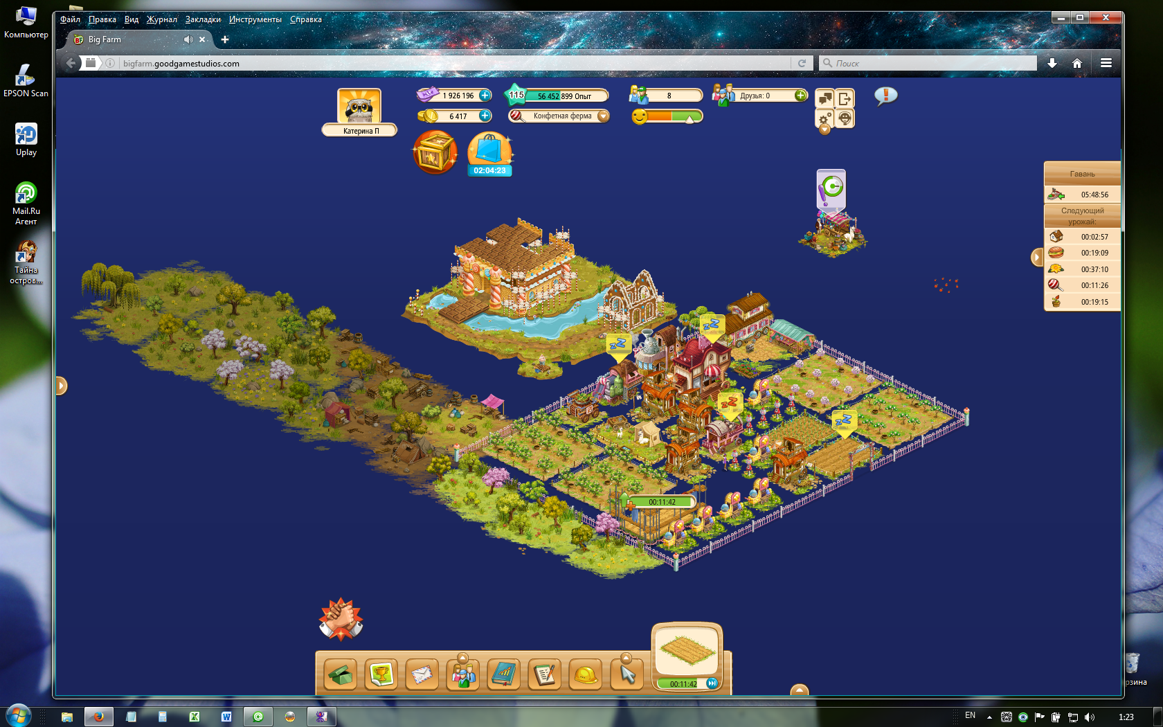 Сегодня уже несколько часов на конфетной ферме урожай могу снять, а запустить производство не могу, не срабатывает и вокруг фермы всё синее-синее и никакого сладкого особняка нет)) куда всё подевалось уже больше 6 часов подряд)) Зато перевести фермодоллары в сладкие доллары курс ЗА 100 фермодолларов 99 999 999 сладких долларов, но повторить это можно через 30 часов. Печалька))