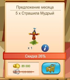 По горячим следам там всё уже исправили. Этим предложением можно воспользоваться пять раз, т.е. купить пугало в количестве пяти штук пока Омар находится на площади. Это аналогично всем предыдущим предложениям, что у него были по декору. И добрее, добрее, вон он какую СКИДКУ предлагает на Страшилу, аж 20% от первоначальной, которая всего-то ничего 120 000 золотых!)))))