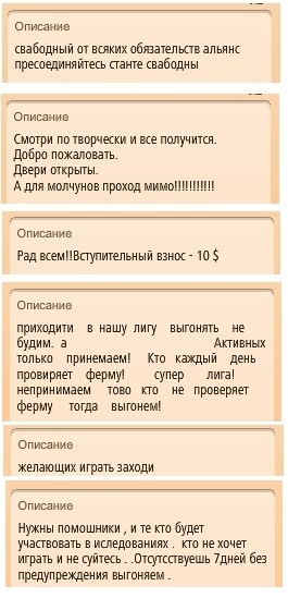Как новичок освоится боле-мене, начинает по чащобе бродить, жалом водить...Чащоба Биг Фарма необъятна. Хозяйств много, все разные. Большие и малые, заброшенные и где жизня ключом кипит. Некоторые селяне аж по нескольку осваивают...У самых-самых не дома, а замки, ввысь уходят от 300 этажей, знающие говорят что особых выгод от этого нет, но престиж какой-никакой, да и "лучше нет красоты, чем по...ть с высоты! Все местные графья и графини люди в общем то приветливые, но угрюмые очень, ругают владельцев чащобы на чём свет стоит, мол задолбали переменами, раньше лучше было. Теперь же за каждый чих платить приходится. На вопрос новичка, чего не бежите из чащобы, ответ один: "Э, милай, чащоба то зачарованная, тропы извилисты, вот и бродим по ним уж который год... Да и бросить то хозяйство жалко.. Стока рублевичей потрачено, а на воле всё заложено-перезаложено..под это дело...печалька.."