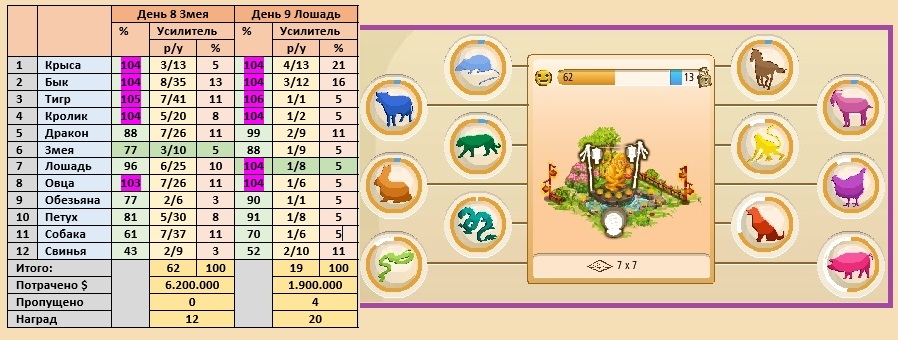 1. Наградной декор 7*7. Количество счастья после ивента в зависимости от вложенных усилий.