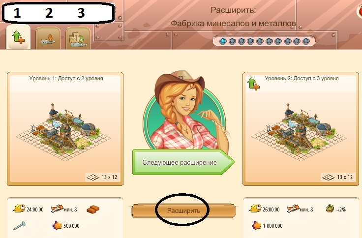 Банк 1-50 уровней; Склад 1-30 уровней; Лесопилка 0-100 уровней; Фабрика 0-100 уровней.