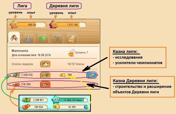 С вводом Деревни лиги изменилась панель Обзора лиги (иконка Рукопожатие). На ней появились дополнительные данные: - Уровень и Опыт Деревни лиги; - Казна Деревни лиги.