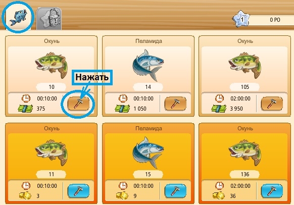 Нажимаем на него. Появляется кружочек с зеленой стрелкой вверх - нажимаем на него столько раз, сколько рыб хотим выпустить в водоем.