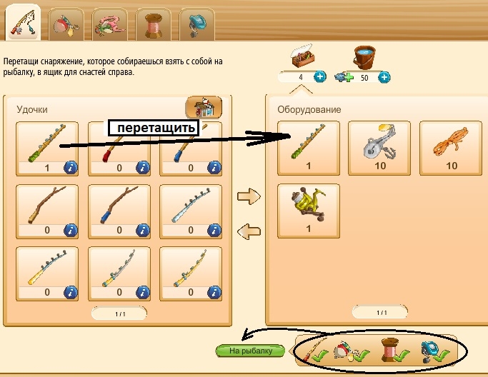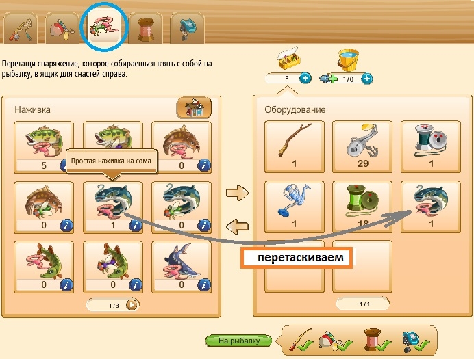2. Заходим в "Ящик для снастей" и перетаскиваем наживку в оборудование.