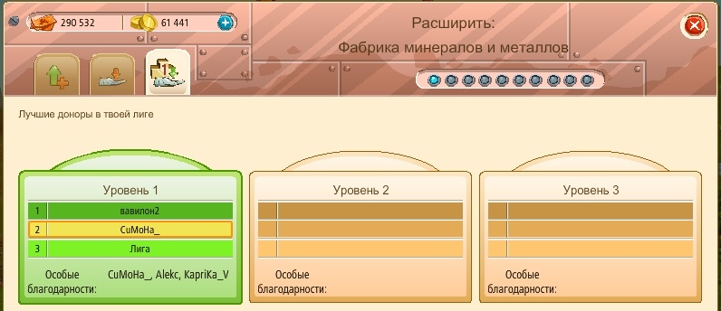 1 вкладка - Расширить - возможно после внесения участниками лиги необходимого сырья => 2 вкладка - Пожертвовать строительные материалы.