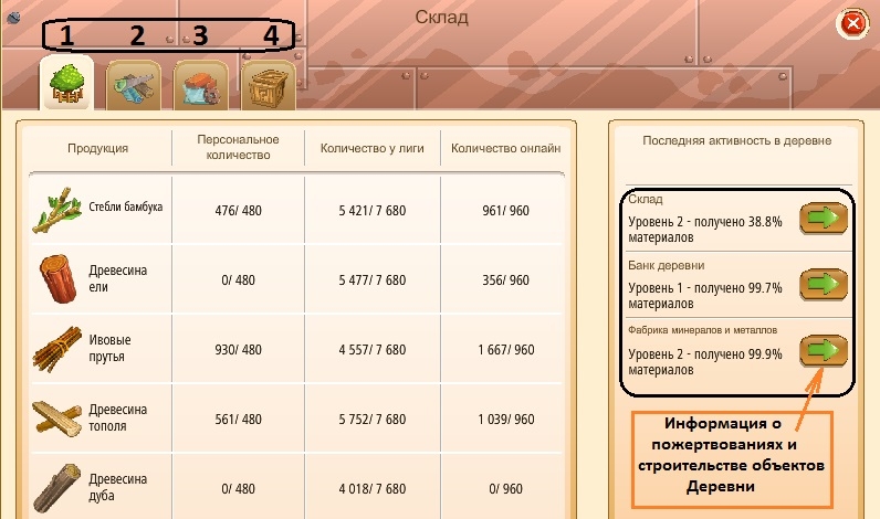 Правая панель - Информация о пожертвовании материалов игроками лиги на строительство и расширение объектов Деревни лиги.