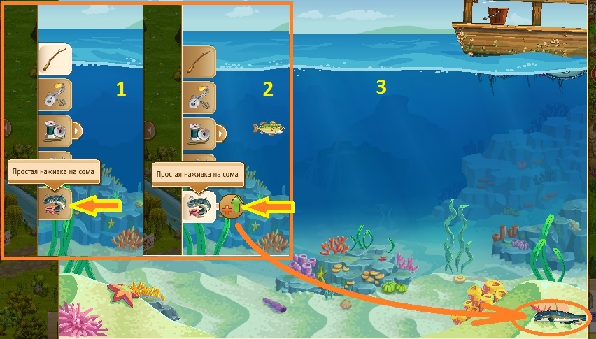 3. Отправляемся на рыбалку. На левой панели появился слот с наживками. Нажимаем на него. Появляется кружочек с зеленой стрелкой вверх - нажимаем на него столько раз, сколько рыб хотим выпустить в водоем.