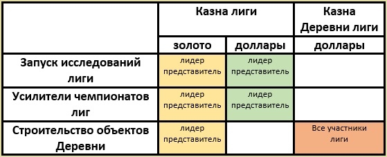Казна Деревни лиги пополняется за счет пожертвований участниками лиги с личного счета Деревни лиги и используется на строительство и улучшение объектов Деревни лиги всеми участниками лиги.
