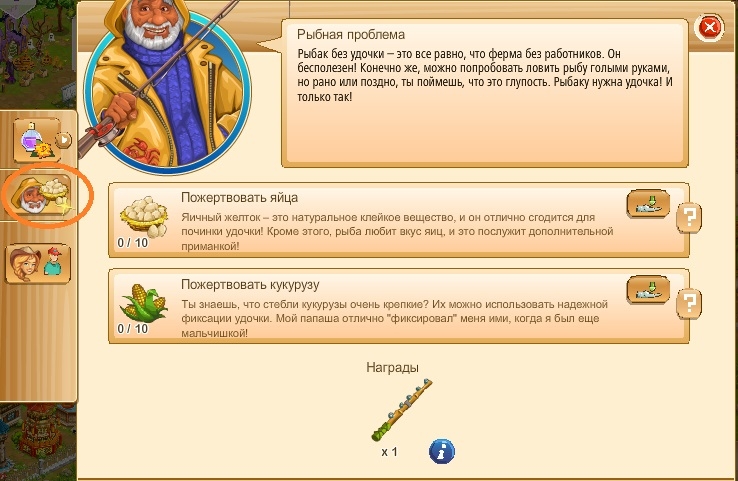 2 Задание. Пожертвовать кукурузу и яйца, чтобы получить удочку.