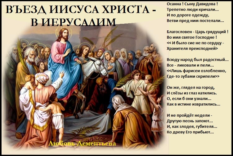 Читайте более подробно: Св. Евангелие от Матфея 21:1-10; Св. Евангелие от Луки 19:29-40; Св. Евангелие от Иоанна 12:12-19.