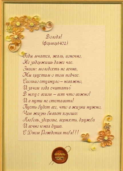 Сегодня день рожденья твой, А сколько стукнуло — неважно. Так будь же вечно молодой, Ведь жизнь дана нам лишь однажды! Желаем жизни полной до краев, Чтоб не было в душе ненастья, Короче говоря, без лишних слов — Большого человеческого счастья![ AstartaRaven] Ирине