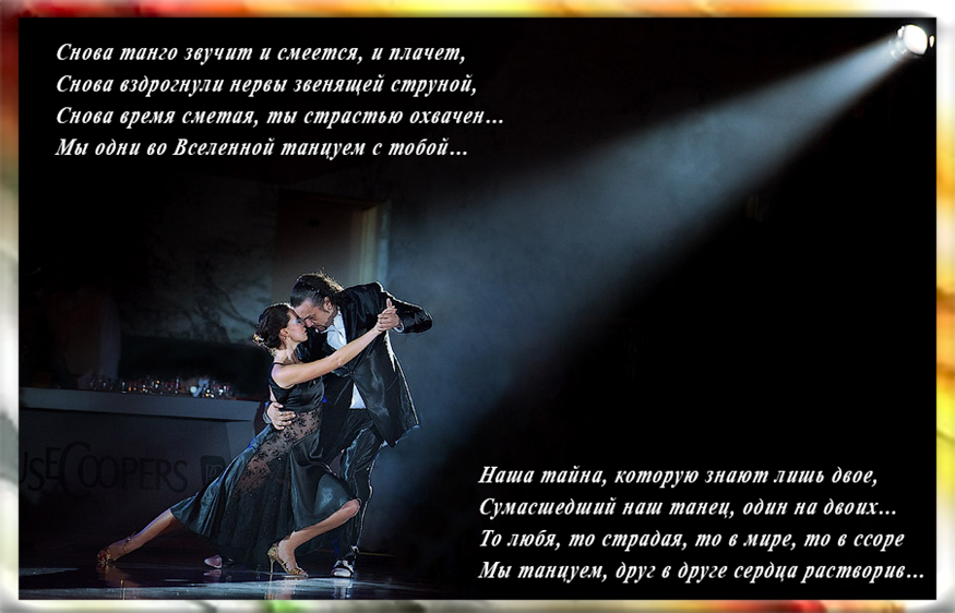 Танго - взаимодействие противоположных энергий, их замыкание, которое даёт то свет, то тьму, порой с такой скоростью, что оно превращается в пламя. Оно обжигает и перетряхивает всё существо, и не важно чем вы его разжигаете... Вашу руку....