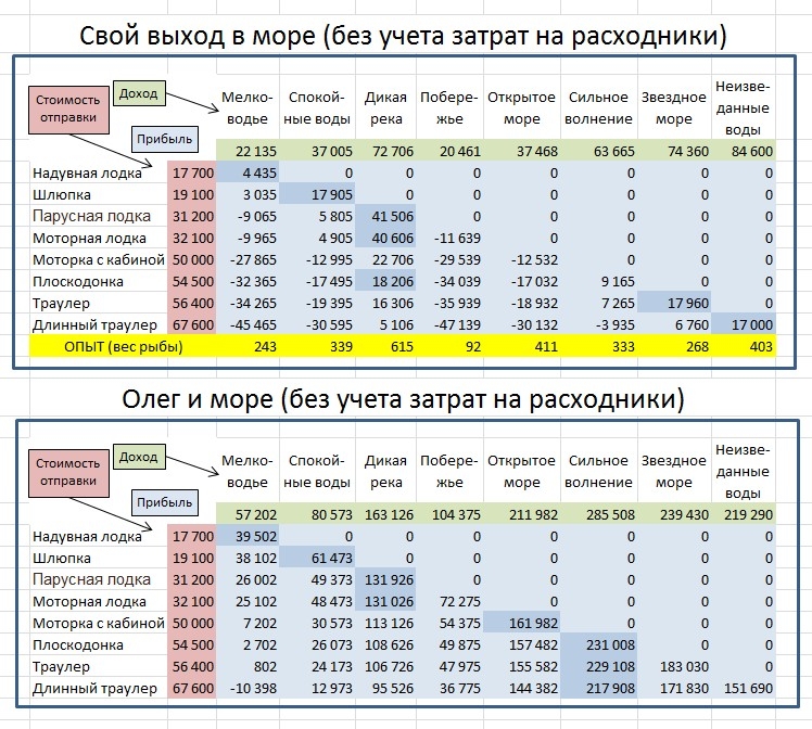 Наблюдения: независимо от лодки, снаряжения(расходников) и уровня рыбака - улов всегда одинаков. Есть подозрения что когда сам выходишь в море - улов может варьироваться, требуется проверка.