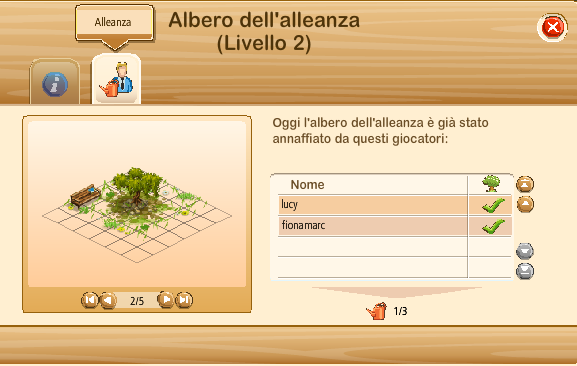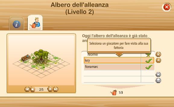 1. Cliccare sulla i di informazioni. 2. Cliccare sulla seconda scheda della finestra che si apre "Alleanza". 3. Cliccare sul nome di un giocatore per accedere alla sua fattoria e annaffiare l'albero