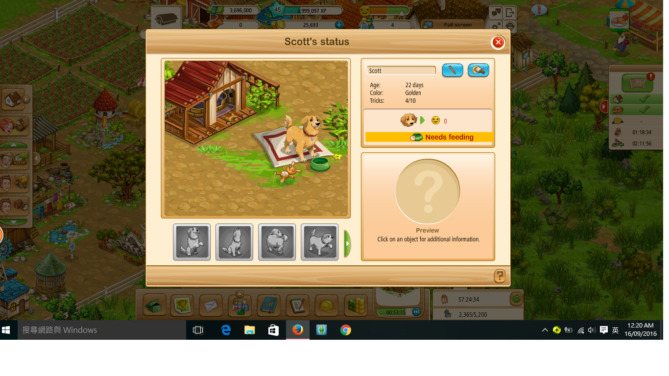 I fed my dog, Damut this morning, but my happiness meter did not move. Damut was sitting in front of his bowl and there was a second dog on my Main Farm standing over him. Did Doodle come over for a visit from the Gourmet Farm?